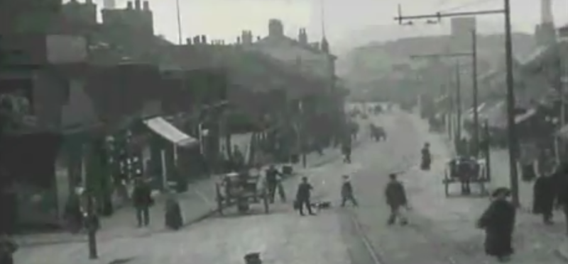 1903 | ![]() Railway Street far right. This picture was taken from onboard a tram, Glossop Tramways operated from 20 August 1903 to 24 December 1927 promoted by the Urban Electric Supply Company Limited. |