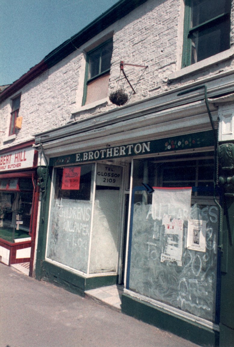 1984 | ![]() E Brotherton, closed down, a wallpaper shop judging by the window painted sign; ’All children’s wallpaper £1.99’. Note the old telephone number - Glossop 2109. Photograph courtesy of Glossop & District Historical Society. |
