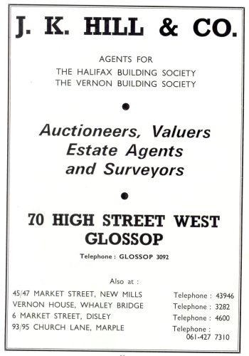 1978 | ![]() Glossop Official Guide Estate Agent - J. K. Hill & Co., 70 High Street West. Tel.: 3092 |