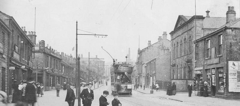 1910 | ![]() The Victoria Inn can just be seen on the left hand side. The Glossop Tramway ran for 24 years from 1903 to 1927, a single-track 4½ mile line running from Hadfield Station, weaving around a number of mills to terminate outside the Queens Arms in Old Glossop. It thought that the tram pictured would have been maroon and cream. |