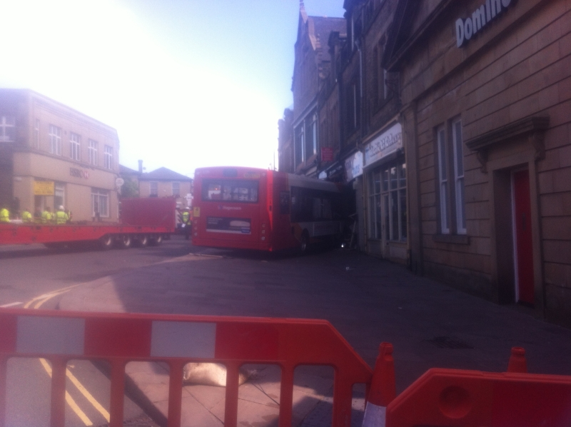 2014 | A recovery vehicle towing a broken down bus collided with buildings in Glossop town centre and became embedded. The collision occurred at around 6pm on 20 May 2014 with the bus becoming embedded in the shop fronts of a taxi company and a takeaway on Victoria Street. The recovery vehicle was wedged between a lamp post and the bank. |