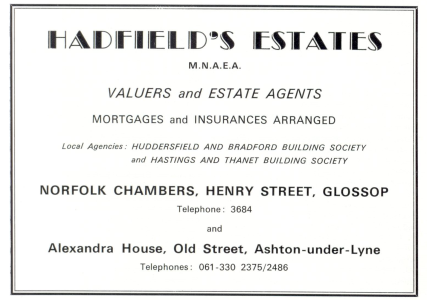 1978 | ![]() Glossop Official Guide Courts - Magistrates’ Court held in the Town Hall every Tuesday. Magistrates’ clerk’s Office, Henry Street. Tel. 3591 Estate Agent - F. J. Clough & Co., Henry Street. Tel.:2424 Estate Agent - Hadfields Estates, Norfolk Chambers, Henry Street. Tel.: 3684 |