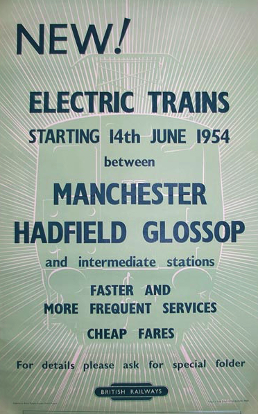 1954 | ![]() Railway poster from 1954 introducing the new electrified line between Manchester Piccadilly and Glossop / Hadfield. |