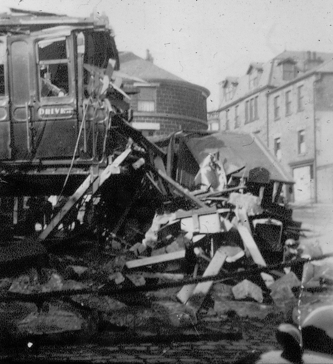 1941 | ![]() There have been two occasions when trains have gone through the buffers at Glossop station, one in 1949 and this one in 1941. Image from a digital collection by Bert Baker. |