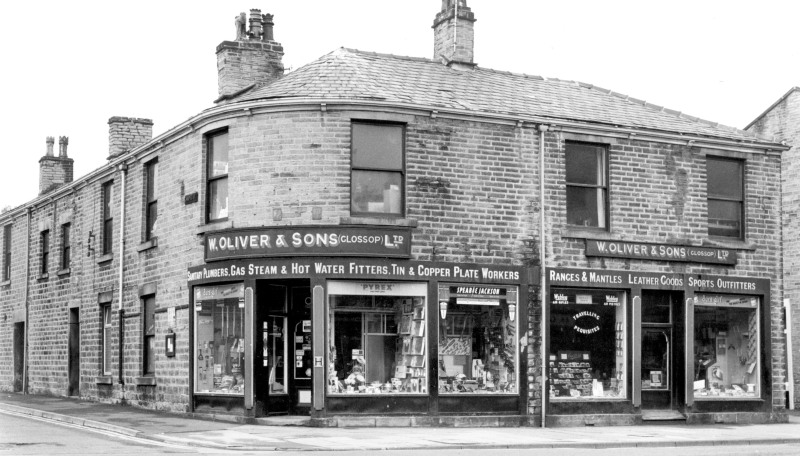 1950 | ![]() W Oliver and Sons (Glossop) Ltd. Sanitary Plumbers, Gas Steam & Hot Water Fitters, Tin & Copper Plate Workers. Ranges & Mantles Leather Goods Sports Outfitters. The date of this photo could be any time between 1930 and 1980. Photograph courtesy of Glossop Heritage Trust. |
