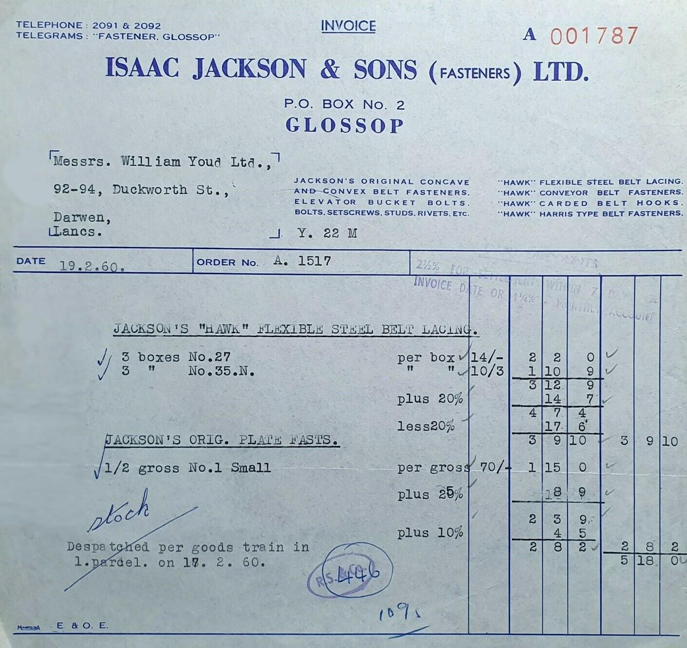 1960 | ![]() An invoice dated 19 February 1960 for 6 boxes of Jackson’s "Hawk" flexible steel belt lacings and half a gross (72) small Jackspn’s original plate fastenings, costing a total of 5 pounds and 18 shillings, dispatched in one parcel via goods train to Darwen, Lancashire. Note that Isaac Jackson offered a 2.5% discount if the invoice was paid within 7 days or 1.25% by monthly account. |